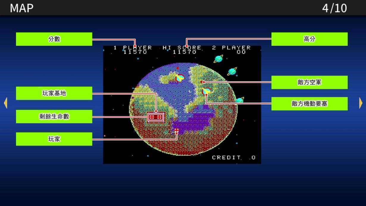 这是一款成为守护地球的飞行员,与从地图画面上逐渐进攻的敌方空军展开战斗(3D射击)或侵入敌方机动要塞(2D射击)的战略游戏,并透过《TAITO MILESTONES》首次移植为家用主机游戏。(1981年作品)