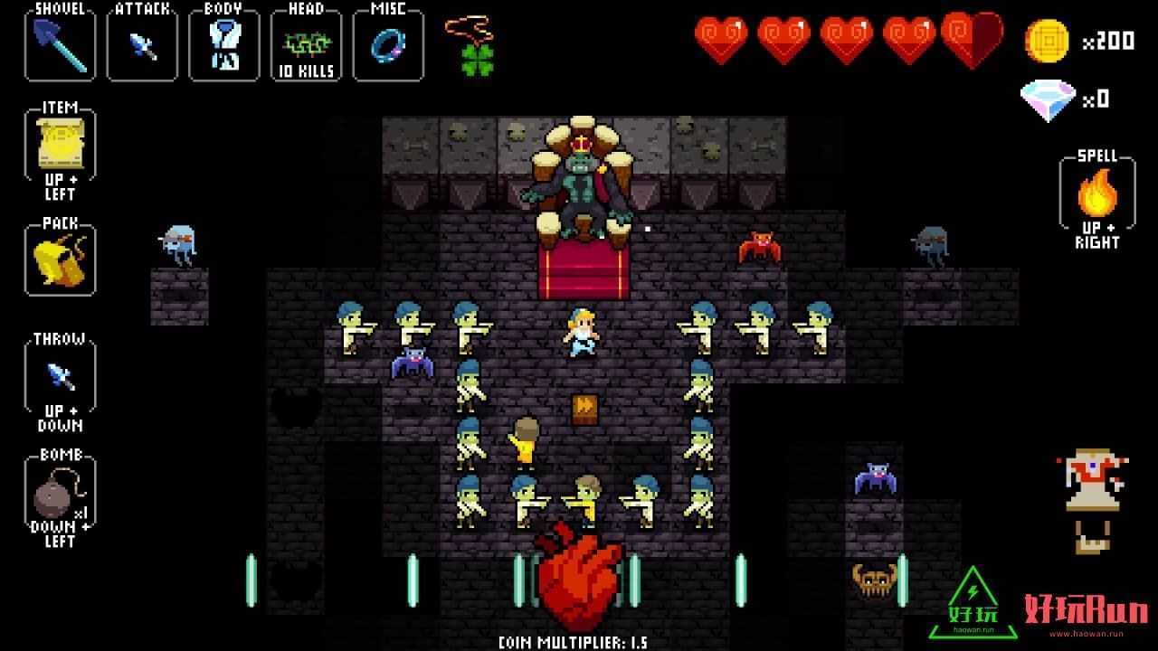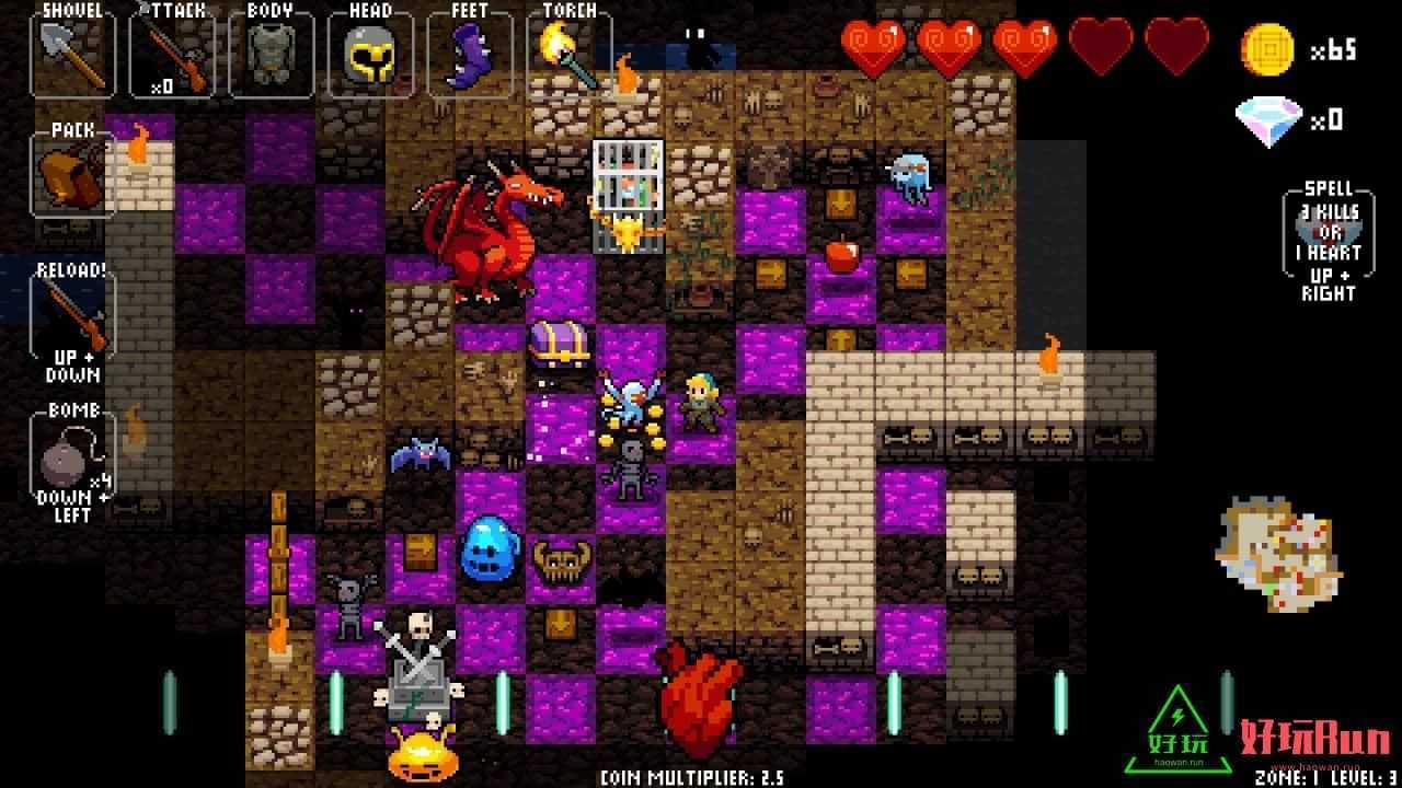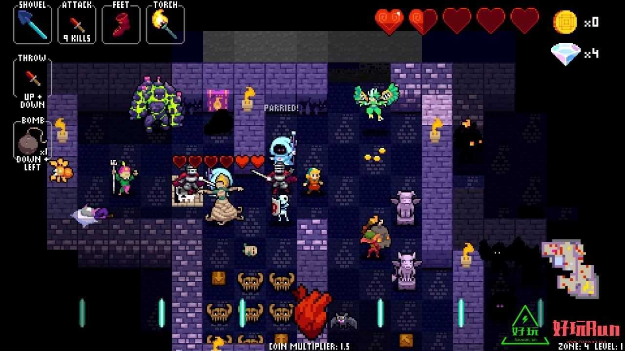 节奏地牢是一款以地牢探险为主题的2D横版动作冒险游戏,采用了像素风格画面,玩家根据背景音乐的节拍杀僵尸、捡道具、炸房子等等玩法,享受欢乐奇妙的地下探险寻宝之旅。